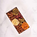 محتویات این باکس شامل گل های خرمالو ، کیوی ، سیب و حبه های سیب آلو ، آلو ، سیب کیوی و آلو زردالو می باشد وزن باکس بین 550تا 600گرم. ابعاد باکس: 22*12